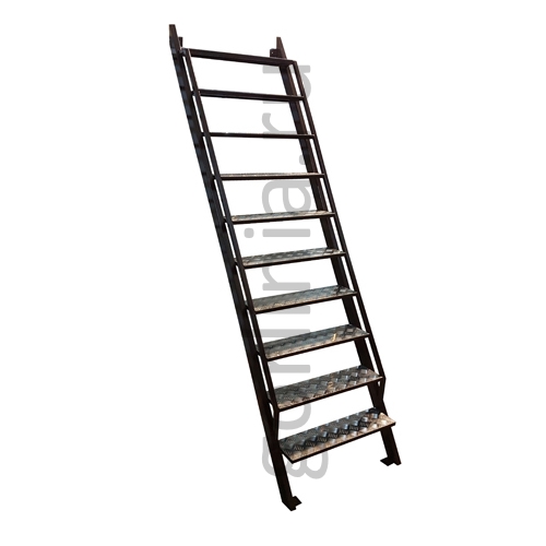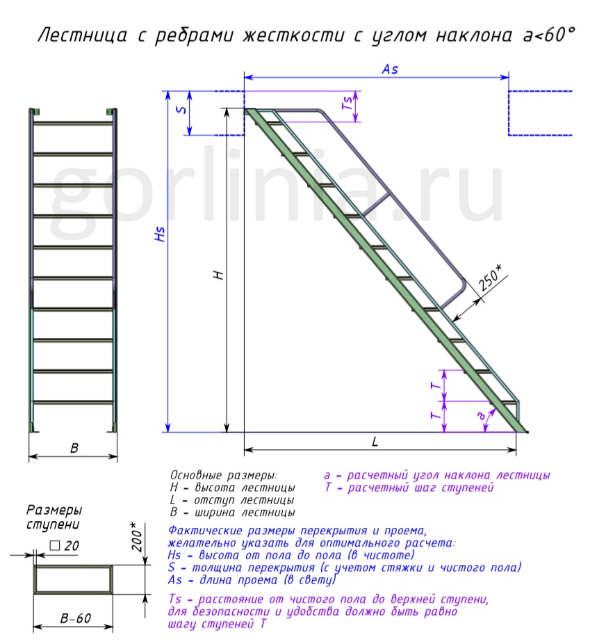 Сокращение угла наклона влечет за собой увеличение размера ступени. Одновременно с этим, уменьшается расстояние между поступью. Ступеньки изготавливаются из профиля 20х20, закрываются алюминиевым листом с насечками.