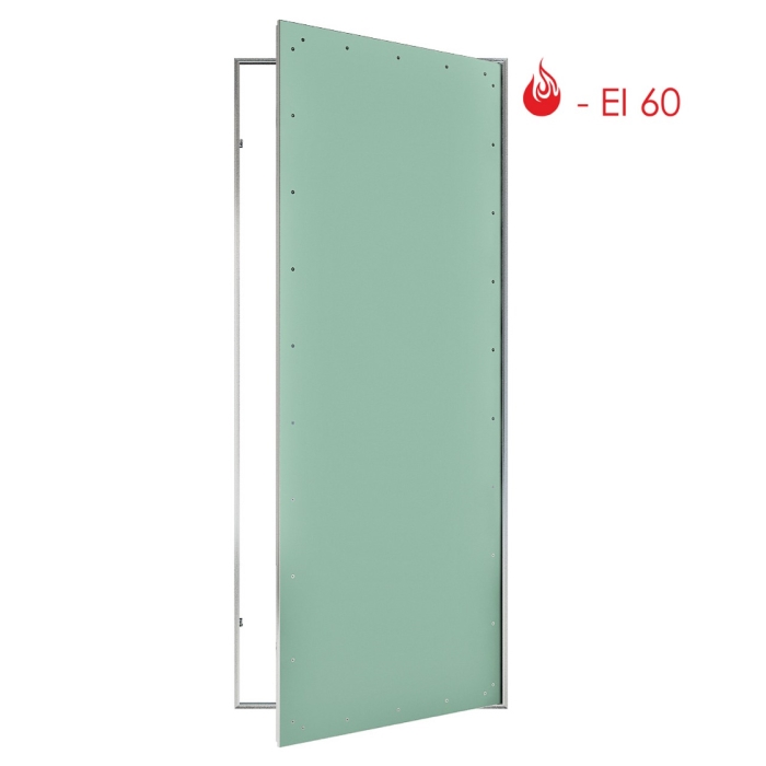 Монтажный размер скрытой коробки из алюминиевого профиля 600х1600х62 мм. Полотно 552*1552 заполнено 2-мя листами влагостойкого гипсоволокна "Knauf", внутри проложена минеральная вата. По контуру притвора в раме проклеена терморасширяющаяся лента.